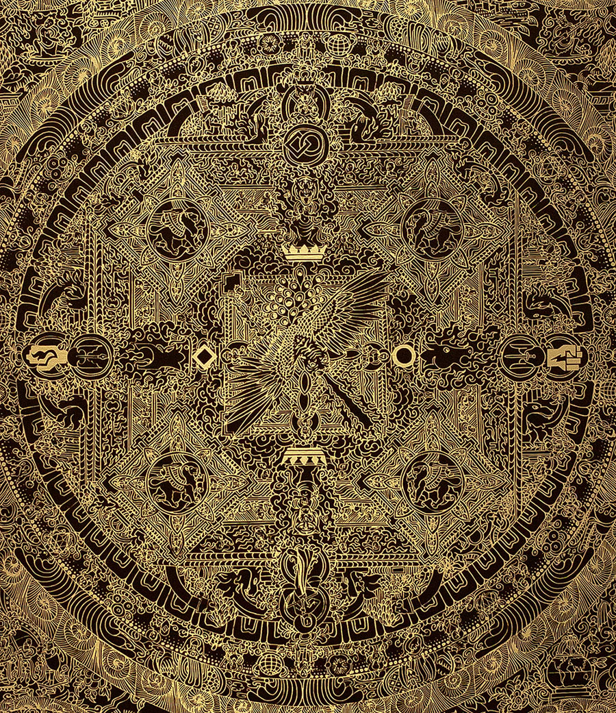 The aesthetic is inspired by Asian Buddhist art, but here each character tells a story of the conflict between A and B.